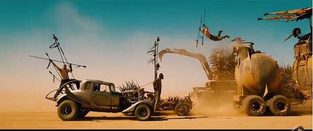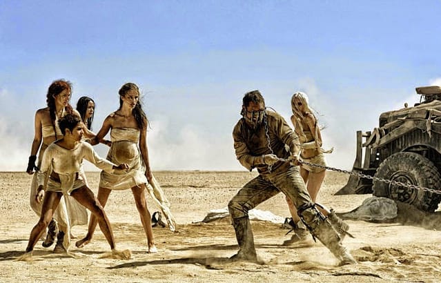 The opening scene of the new Mad Max, in which Max Rockatansky (Tom Hardy) is constantly trying to escape the—now partly human—machine, clawing and scratching as he goes, are perfectly analogous to Chaplin’s bricoleur’s attempt to resist fordist industrial violence. The tension between passivity and frenzied activity is captured in Max’s hanging desperately from the chain-pendulum at the end of the opening sequence, trying to stay out of his pursuers’ reach. Other scenes suggestive of Chaplin’s machinic violence can be seen in Max’s attempt to survive while tied to the front of a vehicle during the long first chase or the scene in which he is fighting someone to whom he is physically chained.